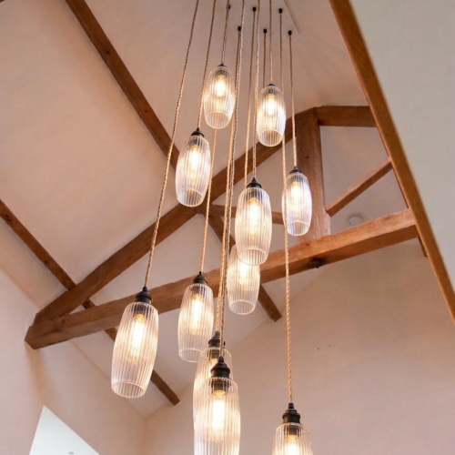 A showpiece of a light. Completely handmade and bespoke. Ideal over a feature staircase. This 11 drop pendant set is designed to make a statement. It features a handmade 800x300mm rectangle ceiling rose. Finished in matte white. It then has 11 pendant drops. Each drop comes with linen fabric designer cable and a sexy flutted glass handblown lampshade. These are 190mm and have a gorgeous curved glass tulip inspired shape. They have a bronzed lampholder. This pendant set is also supplied with Gen3 dimmable 2200k amber warm led squirrel cage lamps. Worth £16 each. On or off this stairway pendant will look incredible. With a max drop of 4metres it can be fitted to a high ceiling and still look incredible.