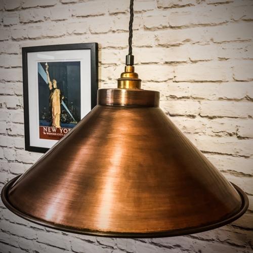 Aged copper statement pendant light 380mm wide shade. This classic aged copper finish is ideal over a country shaker kitchen or family dining tabe. I have used them in many lighting designs for barn conversions and vintage retaurants and bars.