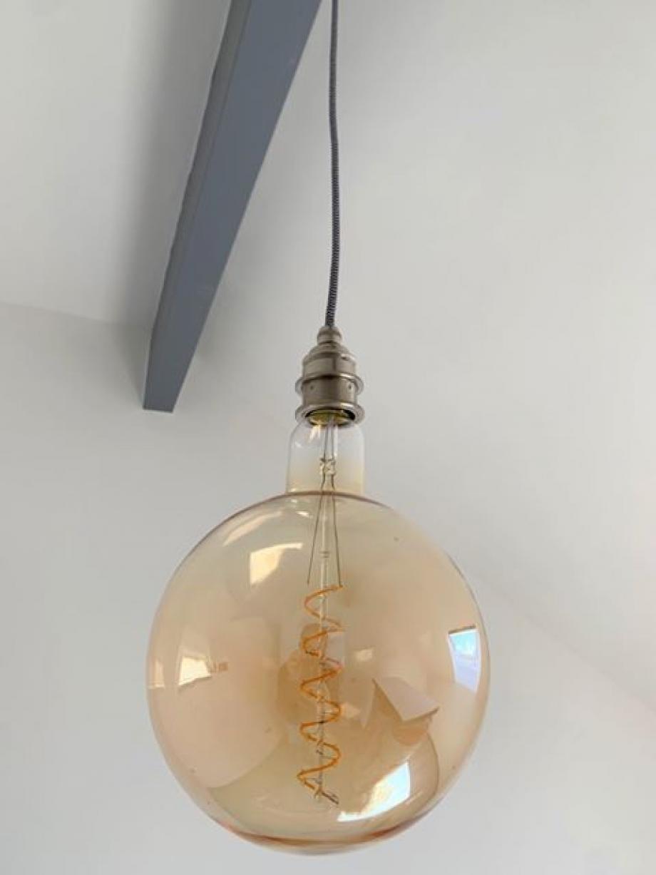 This pendant is not supplied with a lamp, it is pictured with my giant 200mm LED globe lamp which is available online now. I also now offer a range of brushed velvet decorative lampshades which would work with this pendant set. These come in a variety of sizes and colours.