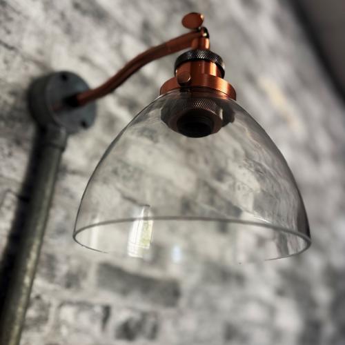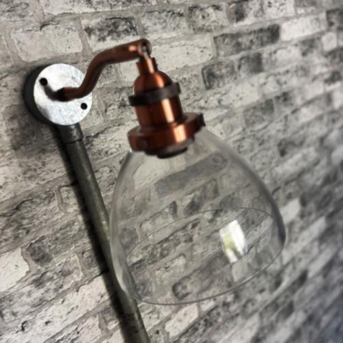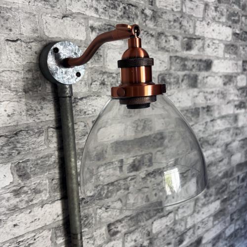Oxford handmade conduit box light. A gorgeous hand blown 140mm clear glass shade. Fitted to a 200mm aged copper adjustable arm. Complimented with knurled metal detailing. A timless and classic design that would suit a mix of applications.