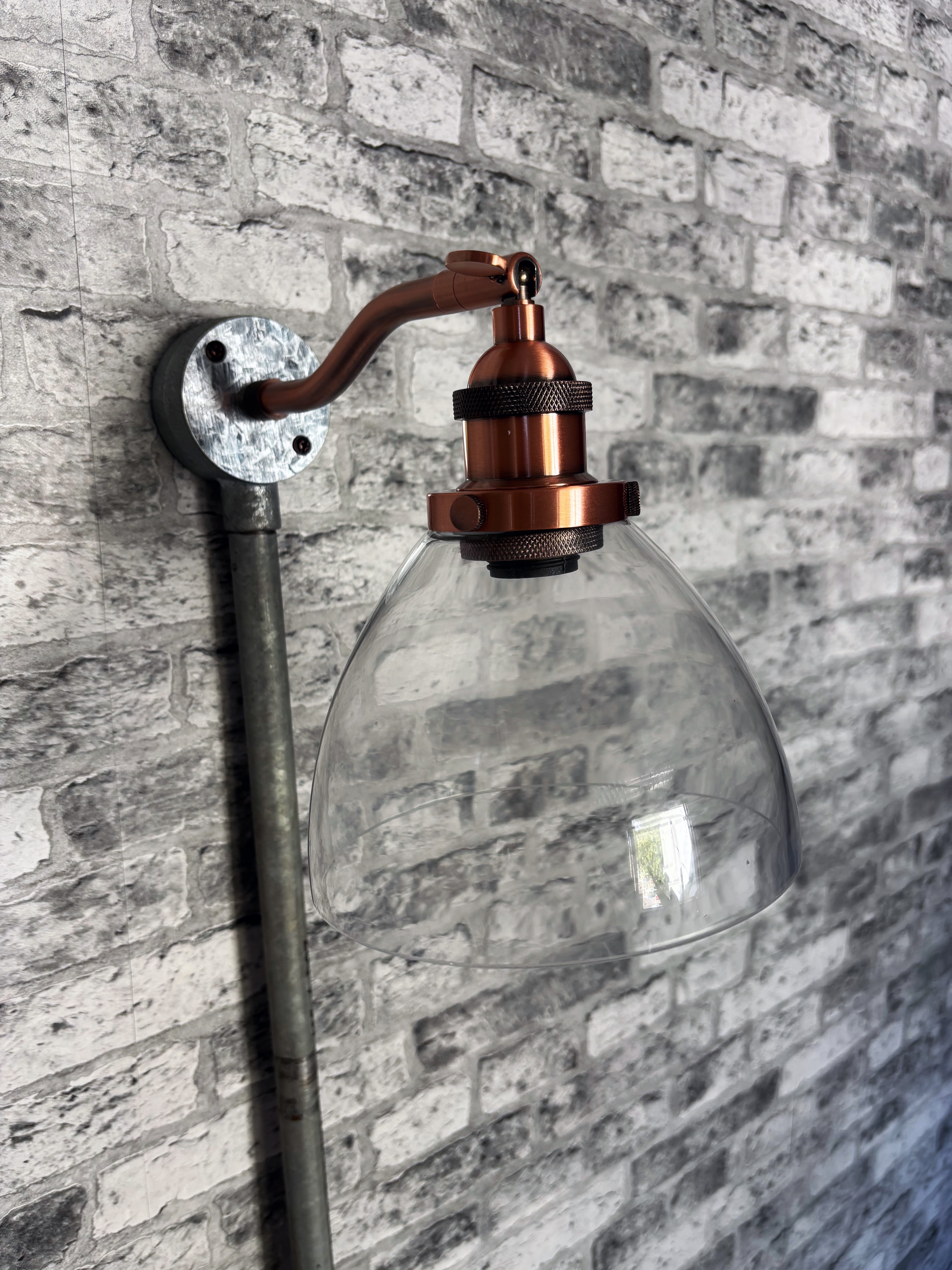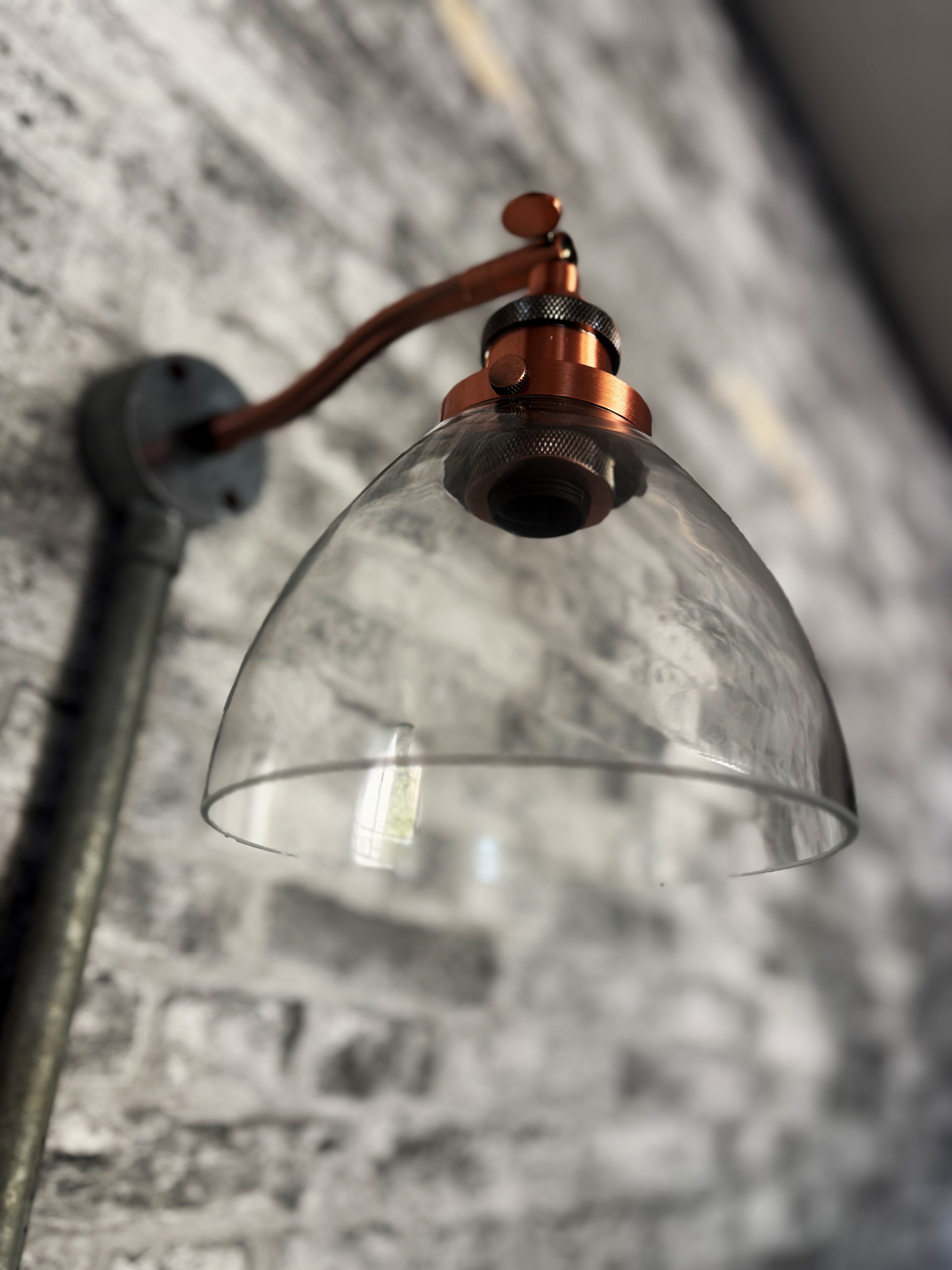 Oxford handmade conduit box light. A gorgeous hand blown 140mm clear glass shade. Fitted to a 200mm aged copper adjustable arm. Complimented with knurled metal detailing. A timless and classic design that would suit a mix of applications.