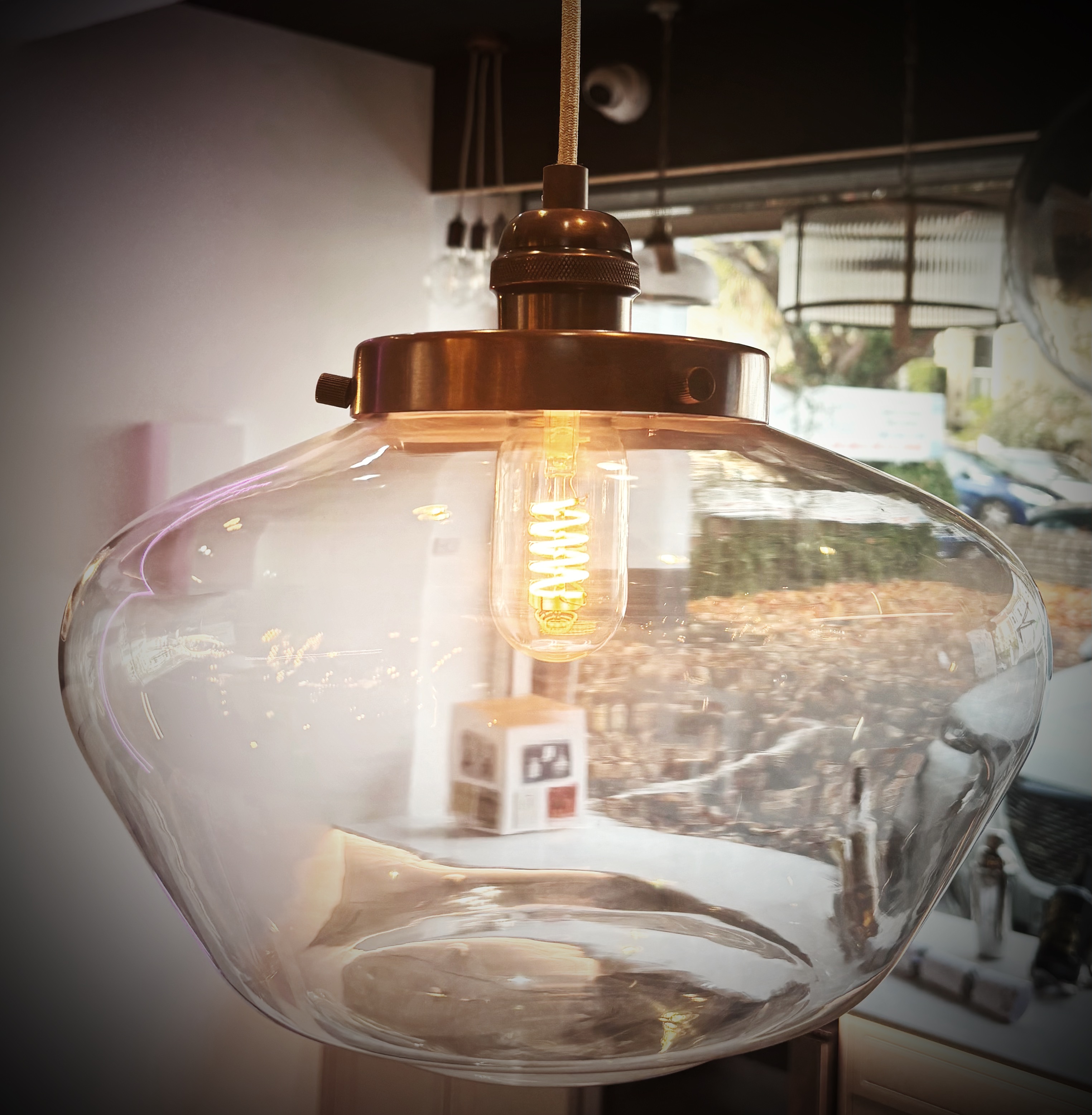 A timeless classically inspired 300mm handblown glass pendant. This beautiful stepped glass shape is a classic look and a famous design. It has an art deco feel. This is a lovely statement light, complete with an aged copper holder and ceiling rose, and 1.5m of linen fabric natural cable. Each pendant takes an E27 LED and would suit a decorative filament led like a squirrel cage or LP60.