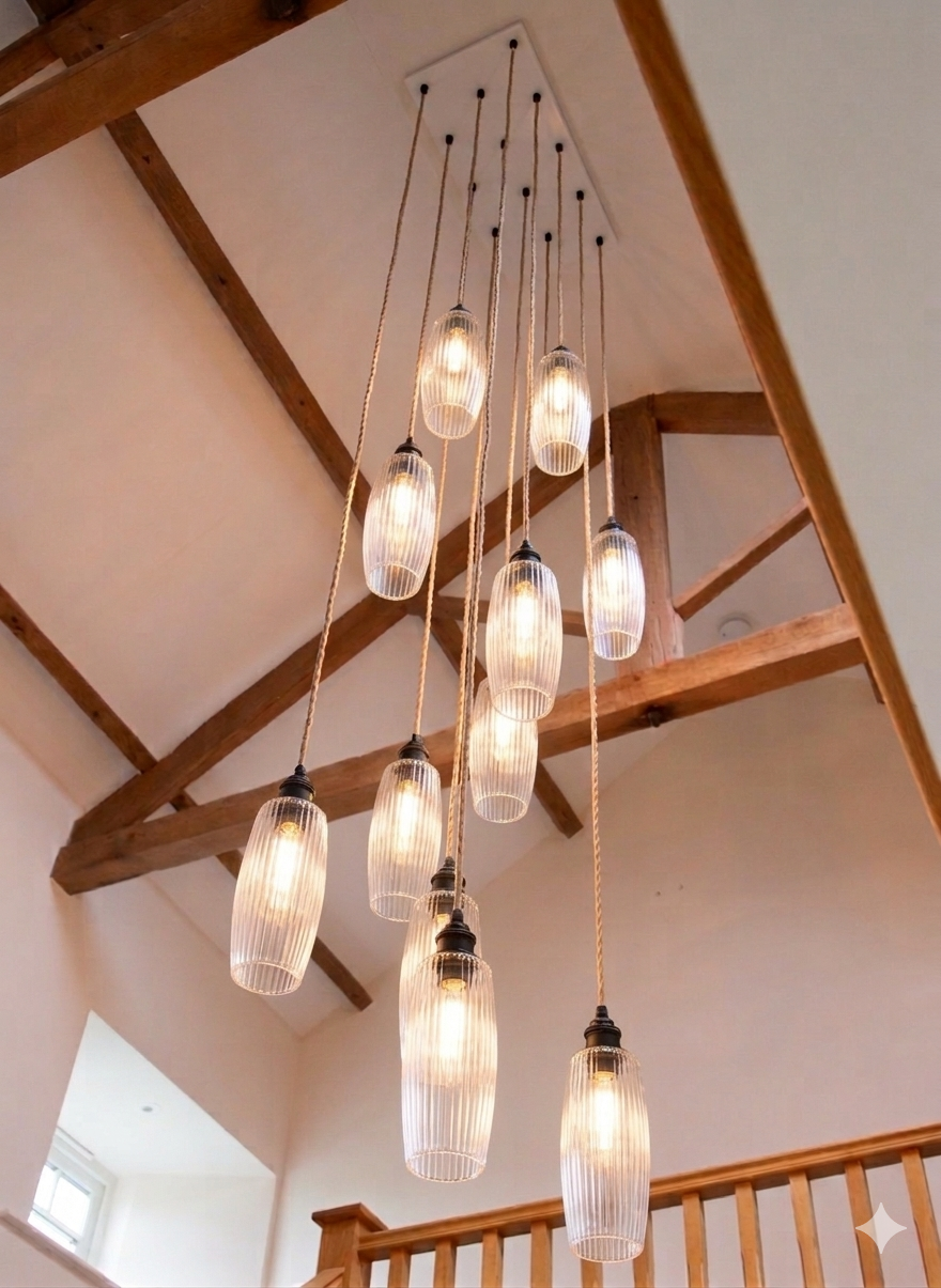 A showpiece of a light. Completely handmade and bespoke. Ideal over a feature staircase. This 11 drop pendant set is designed to make a statement. It features a handmade 800x300mm rectangle ceiling rose. Finished in matte white. It then has 11 pendant drops. Each drop comes with linen fabric designer cable and a sexy flutted glass handblown lampshade. These are 190mm and have a gorgeous curved glass tulip inspired shape. They have a bronzed lampholder. This pendant set is also supplied with Gen3 dimmable 2200k amber warm led squirrel cage lamps. Worth £16 each.